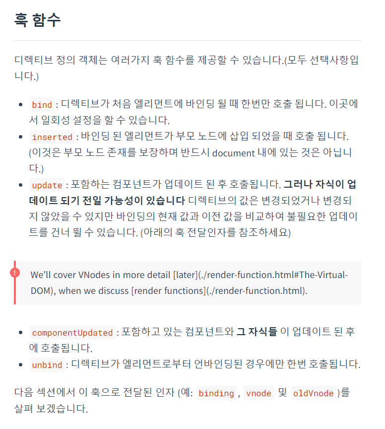 디렉티브의 훅함수는 컴포넌트의 라이프사이클 훅과 비슷합니다. 디렉티브의 라이프사이클 별로 호출되는 함수라고 생각하시면 됩니다.